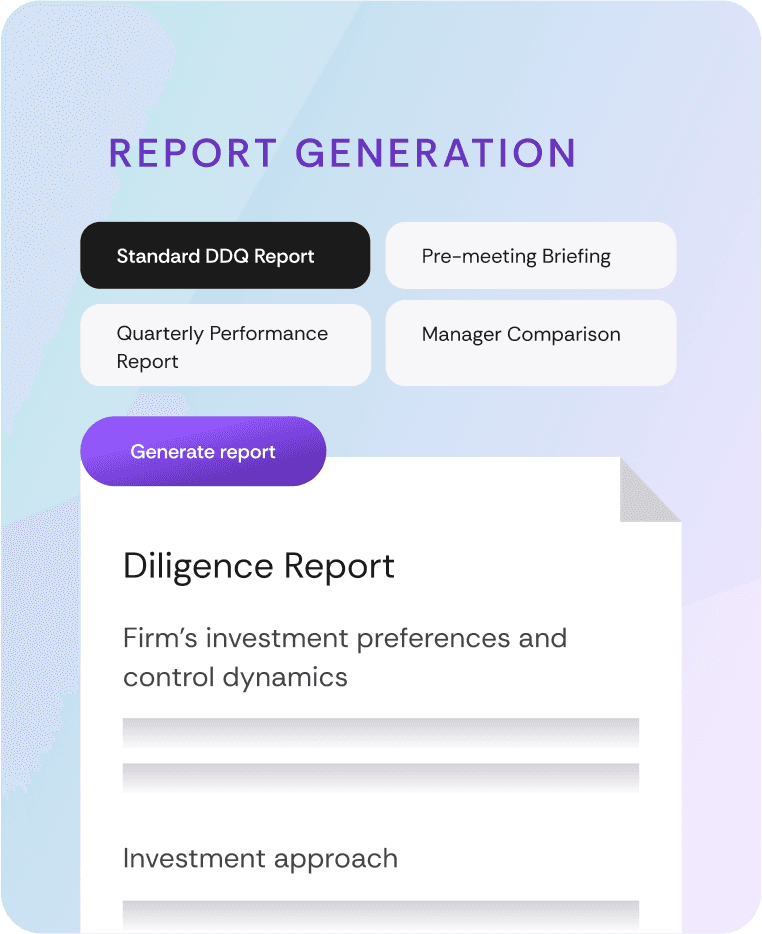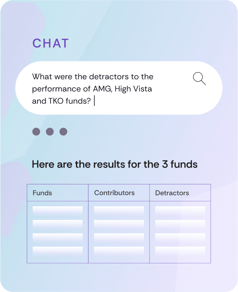 AI processes thousands of documents at once to synthesize complex analysis into simple, easy-to-understand tables. Compare funds across any dimension - strategy, fees, performance - instantly, no matter how much data you need to analyze.